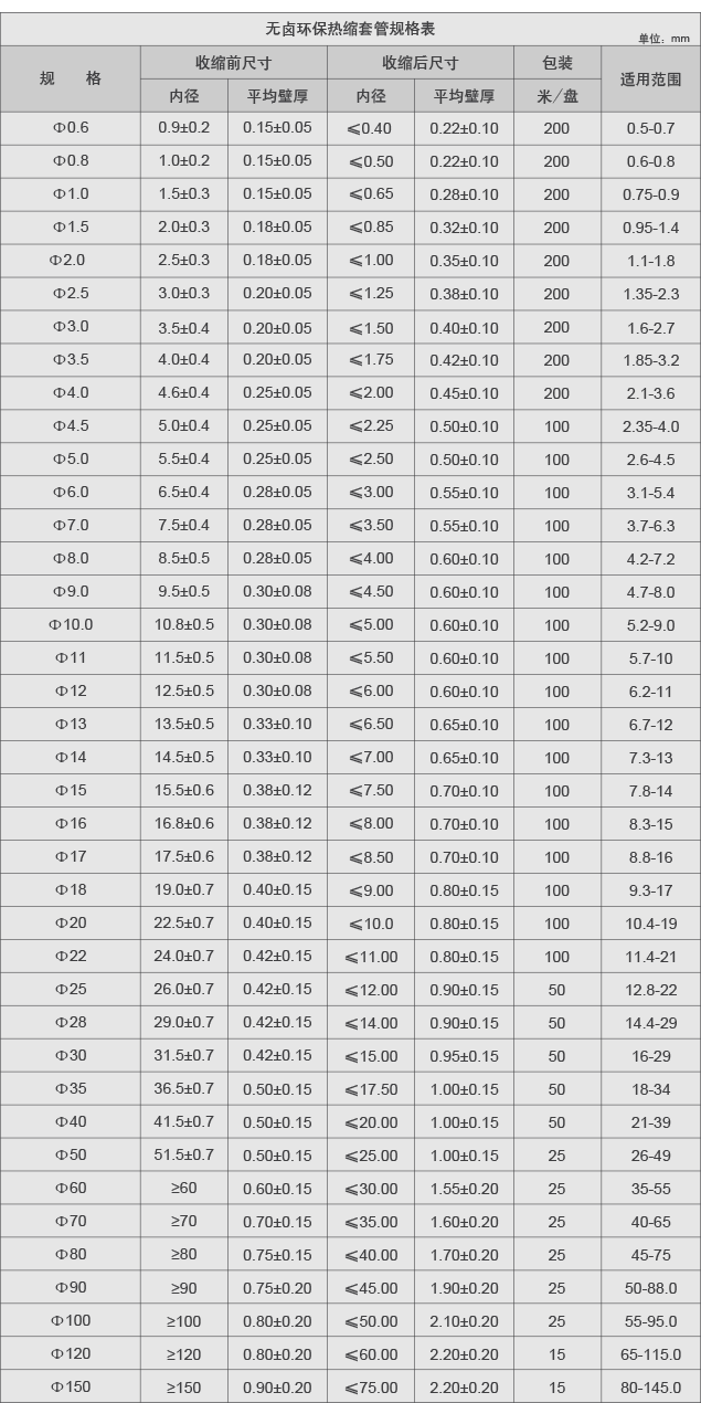 环保热收缩套管采用优质高聚物,经科学配方、机械共混合成高聚合物,产品成型后经电子加速器辐照交联、连续扩张而成。其产品具有柔软、阻燃、收缩快、性能稳定等优点。广泛应用于电线连接,焊点保护,电线端部,线束,电子元器件防护和绝缘处理;健身器材零部件和钢结构表面防护;相关产品的防锈、防腐处理;电线和其他产品的标识等。特点:四大有害元素(镉、铅、铬、汞、 ) 、卤素元素通过 SGS 检测;不含有机锡化合物(三丁基锡类 / 三苯基锡类)、石棉、烟雾剂、限制其释放的物质:甲醛;适用范围:-55℃~125 ℃;开始收缩温度 70 ℃,超薄型完全收缩温度 110 ℃,普通型完全收缩温度 120 ℃。纵向收缩率≤ 8% ;柔软、阻燃;规格齐全,Φ0.8~Φ180,并可根据用户要求进行生产。使用方便,且用烘箱和热风枪加热即可收缩。标准颜:黑色、红色、黄色、绿色、兰色、紫色、灰色,可按客户要求生产其他颜色。安规标准:UL224 VW-1 C-UL CSA C 22.2 OFT。