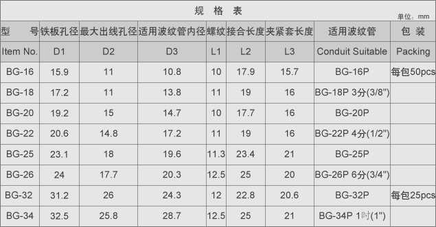 构 造:本产品分成螺帽、本体、及夹紧套三部份,可配合电气管使用;达到固定及防水的作用。